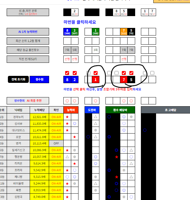 축마는 본인 수정이 가능합니다. 나머지 빈 칸에 마번을 채우시고 삼쌍 조합기를 사용하세요~ |