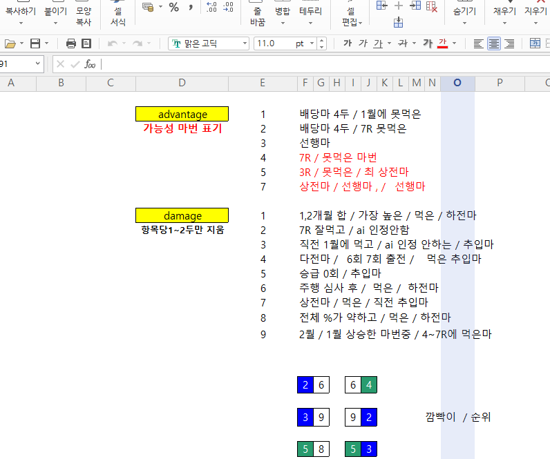 축마는 본인 수정이 가능합니다. 나머지 빈 칸에 마번을 채우시고 삼쌍 조합기를 사용하세요~ |