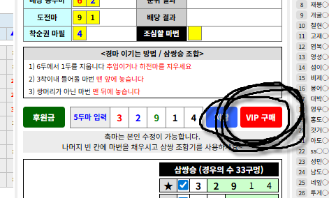 축마는 본인 수정이 가능합니다. 나머지 빈 칸에 마번을 채우시고 삼쌍 조합기를 사용하세요~ |