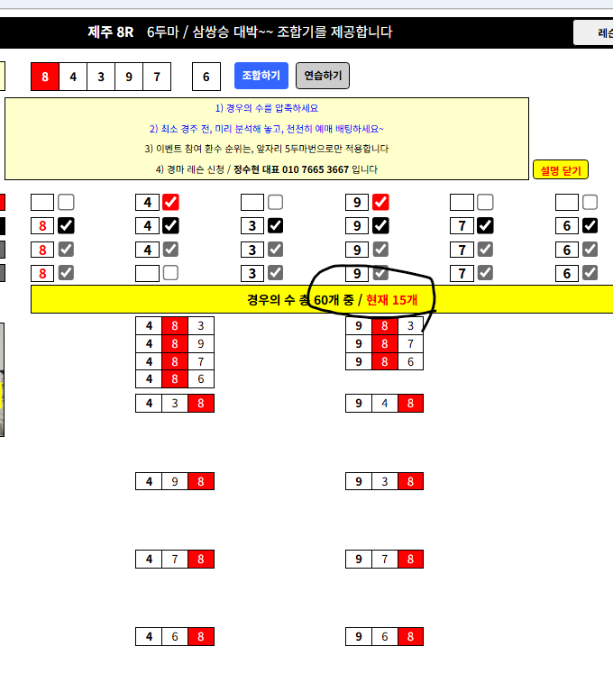 | 축마는 본인 수정이 가능합니다. 나머지 빈 칸에 마번을 채우시고 삼쌍 조합기를 사용하세요~ |