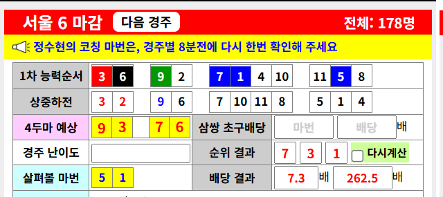 | 축마는 본인 수정이 가능합니다. 나머지 빈 칸에 마번을 채우시고 삼쌍 조합기를 사용하세요~ |