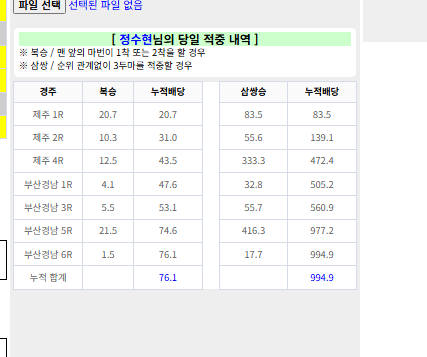 | 축마는 본인 수정이 가능합니다. 나머지 빈 칸에 마번을 채우시고 삼쌍 조합기를 사용하세요~ |