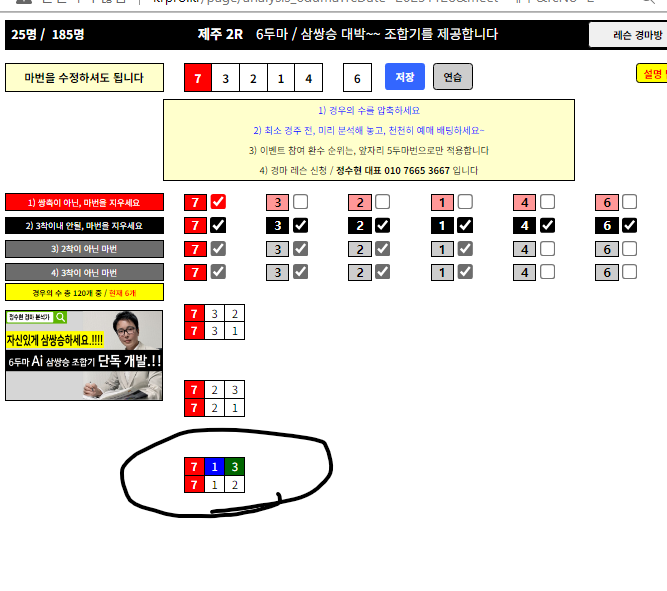 | 축마는 본인 수정이 가능합니다. 나머지 빈 칸에 마번을 채우시고 삼쌍 조합기를 사용하세요~ |