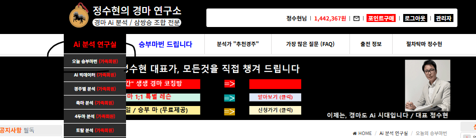 | 정수현 | 네 맞습니다 / ai 분석 연구실 "오늘의 승부마번"을 보시면 레슨 받으신 선생님들의 축마가 보입니다 잘 찾으셨습니다 |